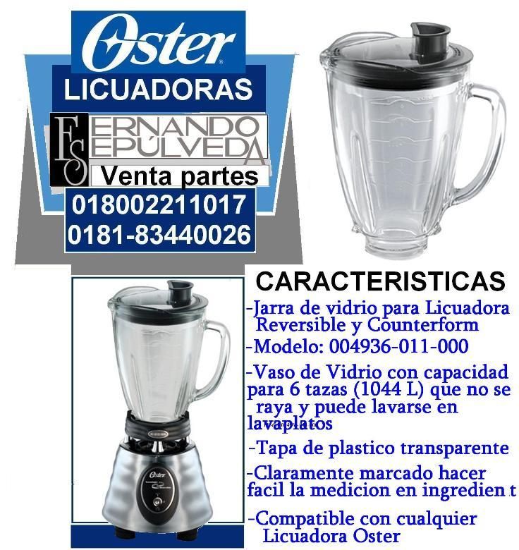 En Fernando Sepúlveda somos distribuidores de refacciones marca Oster y taller de servicio tanto dentro como fuera de garantía de línea licuadoras, contamos con refacciones originales, dentro de los accesorios más comunes y utilizados en la cocina y sobre todo en su equipo de licuadora seria: El vaso o jarra de vidrio para licuadora reversible y counterform Modelo 004936-011-000 con capacidad para 6 tazas (1.44 l) que no se raya y puede lavarse en lavaplatos con la opción de adquirir la tapa de plástico, compatible a toda marca de licuadora Oster y graduación en el vaso para facilitar la medición de proporciones de ingredientes, por otro lado la tapa negra de la licuadora clásica modelo 004903-011-090 para vaso cuadrado compatible con jarra 4954 y 4890 incluye tapón dosificador, el vaso de plástico de la licuadora cube modelo 004917-011-805 con diseño trébol compatible a toda licuadora Oster con capacidad de 1.5 lts opción tapa con dosificador, la tapa negra del vaso de licuadora Modelo BLSTAL-B00 utilizada para vaso modelo BLASTAJ-G00-0111, la tapa blanca de pastico de la jarra de licuadora Oster Modelo BLSTAL-W00, jarra de vidrio modelo BLSTAJ-G00 con capacidad de 1.5 lts o 6 tazas, que no se raya y puede lavarse en el lavaplatos, claramente con graduaciones numéricas para proporcionar a la perfección las medidas de los ingredientes, el vaso de vidrio modelo 004918-011-805 estilo cube forma de cono diseño de trébol de vidrio refractario con capacidad de 1.25 lts compatible a todos los modelos y estilos de licuadora Oster, las cuchillas picahielos tradicionales con empaque de goma o plástico Modelo 004961-013-000 compatible con cualquier licuadora Oster de cualquier modelo y estilo, las cuchillas o aspas picahielos 6 aspas reversibles, Modelo 004980-011-000. También es utilizada la licuadora como procesador de alimentos, diseño especial para licuadoras con motor reversible, procesa ingredientes y pica hielo en forma homogénea y completa, los vasos de plástico clásico modelo 004890-011-805 , capacidad de 1.250 Lts compatible con cualquier licuadora oster con diseño cuadrado.